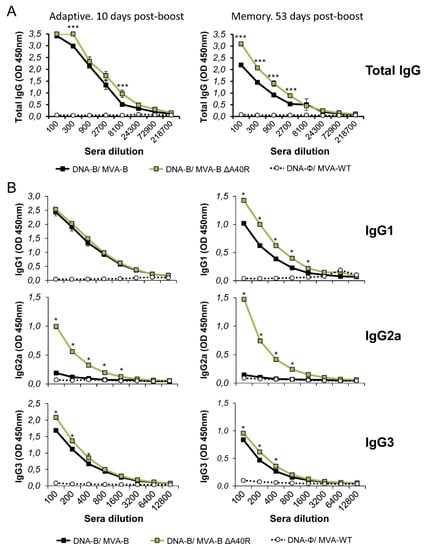Since MVA-B is able to release monomeric gp120 from infected cells and induce humoral immune responses [], which are thought to be necessary to control HIV-1 infection [], we next analyzed the humoral immune responses elicited after immunization of mice with DNA-B/MVA-B and DNA-B/MVA-B ΔA40R. Thus, we quantified by ELISA the total IgG and subclass IgG1, IgG2a, and IgG3 levels of antibodies against HIV-1 gp120 (clade B, isolate BX08) in pooled sera obtained from mice 10 and 53 days post-boost (Figure 6). The results showed that DNA-B/MVA-B ΔA40R elicited significantly higher levels of total IgG anti-gp120 antibodies than DNA-B/MVA-B in the adaptive and memory phases (Figure 6A). Furthermore, analysis of the IgG subtypes showed that DNA-B/MVA-B ΔA40R induced significantly higher levels of IgG1, IgG2a, and IgG3 anti-gp120 antibodies than DNA-B/MVA-B (Figure 6B), with IgG1 levels being higher than IgG3 and IgG2a levels, in both groups indicating a Th2 response. However, the analysis of the IgG2a/IgG1 ratio showed that DNA-B/MVA-B ΔA40R induced a higher ratio than DNA-B/MVA-B, suggesting a shift toward a Th1 response.