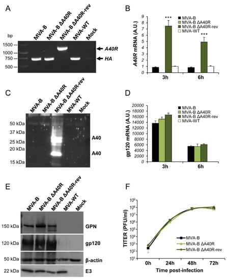 Finally, the growth kinetics of MVA-B ΔA40R-rev in cultured permissive DF-1 cells was similar to that of MVA-B and MVA-B ΔA40R, confirming that the reintroduction of the MVA A40R gene did not affect MVA replication in vitro (Figure 7F).