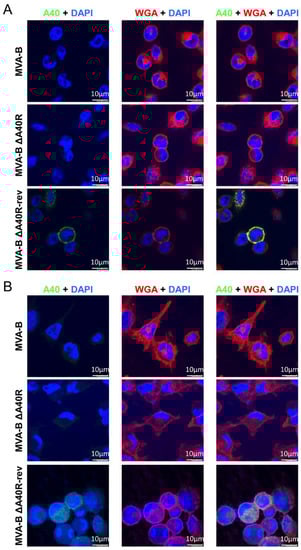 Previous studies have reported that VACV WR A40 protein is expressed at the cell surface []. Thus, the expression and intracellular localization of the MVA A40 protein expressed by MVA-B ΔA40R-rev was next studied by confocal immunofluorescence microscopy in non-permissive HeLa cells. Therefore, cells were infected with MVA-B, MVA-B ΔA40R, and MVA-B ΔA40R-rev for 18 h, and then non-permeabilized or permeabilized fixed cells were stained with a polyclonal antibody against VACV A40 protein and the specific wheat germ agglutinin (WGA) probe to label the cell surface and Golgi reticulum (Figure 8). The results showed that in non-permeabilized cells, A40 protein (in green) was expressed in cells infected with MVA-B ΔA40R-rev and, as expected, co-localized with the cell membrane, whereas it was not detected in cells infected with MVA-B or MVA-B ΔA40R (Figure 8A). On the other hand, in permeabilized cells, A40 protein (in green) was expressed in cells infected with MVA-B ΔA40R-rev with a diffused cytoplasmic pattern; again, no detection of A40 protein was observed in cells infected with MVA-B or MVA-B ΔA40R (Figure 8B), probably due to poor reactivity of the anti-A40 antibody used.
