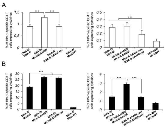 The magnitude of the total HIV-1-specific CD4+ T-cell immune responses induced by the DNA-B/MVA-B ΔA40R-rev (Figure 10A, left panel), or the MVA-B ΔA40R-rev/MVA-B ΔA40R-rev (Figure 10A, right panel) immunization groups was significantly lower than that induced by DNA-B/MVA-B ΔA40R or MVA-B ΔA40R/MVA-B ΔA40R, respectively, but similar to that induced by the DNA-B/MVA-B group and lower than that induced by the MVA-B/MVA-B group (Figure 10A). Furthermore, the analysis of the HIV-1-specific CD8+ T-cell immune responses showed that homologous MVA-B ΔA40R-rev/MVA-B ΔA40R-rev immunization group induced significantly lower responses than MVA-B ΔA40R/MVA-B ΔA40R that were similar to MVA-B/MVA-B (Figure 10B, right panel). However, the heterologous DNA-B/MVA-B ΔA40R-rev immunization group did not decrease the magnitude of HIV-1-specific CD8+ T-cell immune responses compared to DNA-B/MVA-B ΔA40R, probably influenced by the DNA priming that frames the quality of the immune responses prior to a poxvirus protein boost, as recently described []. Collectively, these results confirmed that the reintroduction of MVA A40R gene in MVA-B ΔA40R restores the magnitude of the HIV-1-specific T-cell immune responses.