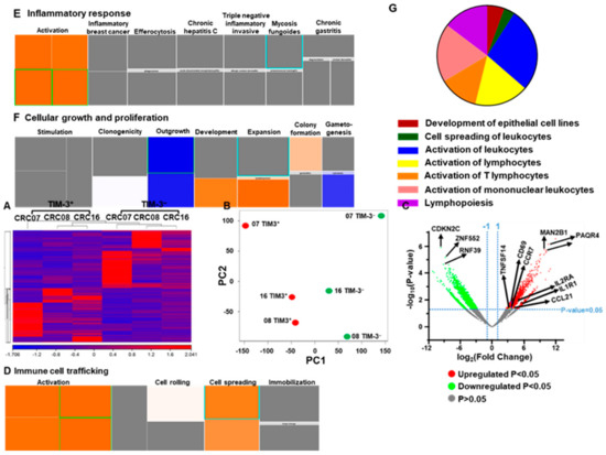 Differential gene expression of CD4+TIM-3+ and CD4+TIM-3− TILs. Hierarchical clustering of three TIM-3+ and three TIM-3− libraries (from patients CRC07, 08, and 16) on differentially expressed RNA transcripts from RNA-Sequencing data. Each column represents a sample and each row represents a transcript. Expression level of each gene in a single sample is depicted according to color scale (A). PCA plot shows the clustering of RNA transcriptome from of three TIM-3+ and TIM-3− libraries (B). Volcano plot summarizes the expression rate (log2 Fold Change) on the x-axis and the statistical significance (negative log10-transformed p values) on the y-axis. The fold changes with significant p value (>0.05) of upregulated and downregulated genes are highlighted in red and green, respectively (C). Tree map (hierarchical heat map) depicting affected functional categories based on upregulated transcripts, immune cell trafficking (D), inflammatory response (E), and cellular growth and proliferation (F). Each individual colored rectangle is a particular biological function and the color range indicates its predicted activation state: increasing (orange) or decreasing (blue). Darker colors indicate absolute Z-scores. In this default view, the size of the rectangle is correlated with increased overlap significance. Top significantly upregulated migration and metastasis-related genes in TIM-3+ T cells (Z-score of >1.45) based on ingenuity pathways analysis (IPA) analyses are shown as a pie chart (G).