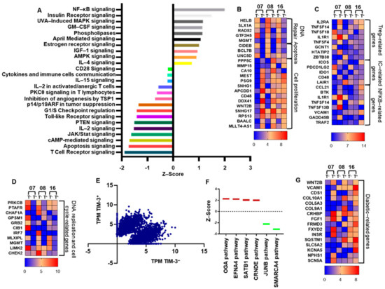Transcriptomic profile of CD4+TIM-3+ and CD4+TIM-3− TILs categorized by their functional characteristics. Top significantly affected (>−2 Z score < 2) canonical pathways based on IPA analysis. The horizontal bars denote the different pathways based on the Z-scores (A). Heat maps show the fold changes relative to the mean expression of DNA repair, apoptosis, and cell proliferation (B), Treg, IC, and NF-κB-related genes (C), DNA replication and cell cycle-related genes (D). Scatter plots show gene expression analyses by RNA-Sequencing in TIM-3+ and TIM-3− T cells. X and Y axes represent TPM (Transcripts Per Million) of TIM-3+ and TIM-3− T cells (E). Box plots show the Z-score of genes involved in tumor progression pathways of TIM-3+ T cells based on IPA analysis (F). Heat maps show the fold changes relative to the mean expression of diabetic-related genes (G).
