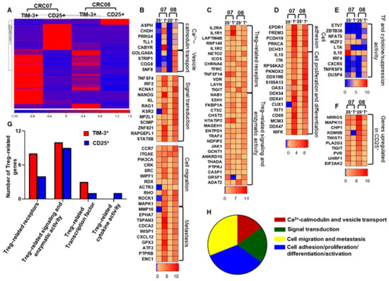 Next, we compared the transcriptomic profile of CD4+TIM-3+ T cells with conventional CD4+CD25+ Tregs. We sorted CD4+TIM-3+ and CD4+CD25+ T cells from three CRC NT and TT samples. We found that about half of the TIM-3+ cells were CD25− population (Supplementary Figure S3). Library preparation and subsequent RNA-Sequencing were performed for CD4+TIM-3+ and CD4+CD25+ T cells from two TT samples (CRC07 and 08). Here, we found a distinct cluster of differentially expressed genes in TIM-3+ and CD25+ T cells (Figure 5A). Next, we found that genes related to cell migration including ACTR3, CCR7, ITGAE, PIK3CA, CRC, SRC, WIPF1, RDX, RHO, ROCK1, and MAPK1 [28] were upregulated in CD4+TIM3+ TILs (Figure 5B, bottom heat map). Additionally, CD4+TIM3+ TILs also upregulated tumor metastasis-related genes, including MMP16, EPHA7, TSPAN3, CDCA2, WISP1, CXCL12, GPX3, ATF3, PTPRB, and EC1 (Figure 5B, bottom heat map, p value < 0.01). Genes including calcium-calmodulin signaling (ASPH, CHDH, PRRG4, TLL1, and CABYR), vesicle transport (GOLGA6A, STRIP1, COG8, and SNF8), signal transduction (TNFSF4, IRF2, KCNA1, NANOG, KL, RAG1, KSR2, MPZL1, SCIMP, ZNF821, RAPGEFL1, and STAT5B), cell migration (PLAT, RLTPR, TPTEP1, SNX5, CHST3, PRKCE, CRMP1, and SYNE3) and tumor metastasis (MMP16, EPHA7, TSPAN3, CDCA2, WISP1, CXCL12, GPX3, ATF3, PTPRB, and ENC1) were significantly upregulated in TIM-3+, compared with CD25+ T cells (Figure 5B,H, p value < 0.01). The hierarchy of the percentages of upregulated gene categories are as follows; cell adhesion/proliferation/differentiation/activation (34%) > cell migration and metastasis (31%) > signal transduction (20%) > Ca2+ calmodulin and vesicle transport (15%) (Figure 5H). Additionally, we found that Treg-related genes [29] including IL2RA, IL1R1, LAPTM4B, RNF145, IL1R2, NETO2, ICOS, CHRNA6, TFRC, TNFSF14, VDR, LAYN, and TIGIT, involved in receptor signaling (Figure 5C,G); NAB1, SSH1, FKBP1A, CTSC, CHST2, HTATIP2, MAGEH1, ENTPD1, TRAF3, NDFIP2, JAK1, GCNT1, ANKRD10, THADA, and PTPRJ, involved in enzymatic activity (Figure 5C,G); transcription factor and suppression activity-related genes including ETV7, ZBTB38, NFAT2, IKZF2, LTA, IRF4, CXCR5, TNFRSF9, and DUSP4, were significantly upregulated, and IL10 and IKZF2 (Figure 5E,G) were downregulated in TIM-3+, compared with CD25+ TILs. Furthermore, genes related to cell-cell adhesion (EPDR1, FREM3, PCDH19, PRKCA, and DCHS1) and cell proliferation and differentiation (some of the genes including IL15, ITK, OAS3, DDX54, DDX41, CUX1, CD69, and NIFK), were upregulated in TIM-3+ cells (Figure 5D,H, p value < 0.01). These data suggest that CD4+TIM-3+ TILs may contribute more than conventional CD4+CD25+ Tregs to the tumor evasion and metastasis.