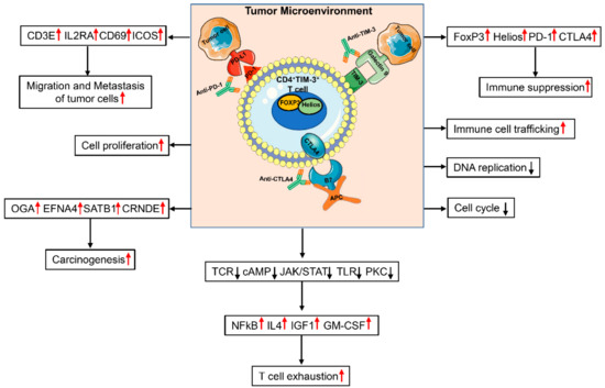 Schematic diagram summarizes genes/functions that are upregulated or downregulated in CD4+TIM-3+ T cells in the colorectal tumor microenvironment. In the colorectal TME, CD4+TIM-3+ cells co-express genes including FoxP3, Helios, PD-1, and CTLA-4 to suppress anti-tumor immune responses. Our study showed that DNA replication and cell cycle genes were downregulated, while genes related to immune suppression, cell proliferation, T-cell exhaustion, carcinogenesis, migration, and metastasis were upregulated in CD4+TIM-3+, compared with CD4+TIM-3−. Individual or combinational antibody therapies using anti-TIM-3, anti-PD-1, and anti-CTLA4 may target highly immunosuppressive TIM-3+ TILs to elicit anti-tumor responses in CRC.