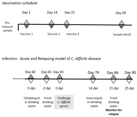 Schematic of schedule of vaccination and antibiotic treatments used to establish acute and relapsing C. difficile disease in mice. The vaccination schedule highlights the days vaccines were given and sample bleeds taken for immune evaluation, whilst the infection schedule indicates the timing of antibiotic treatments and C. difficile challenge.
