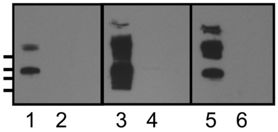 Western blot analysis of spore surface extracts. Lanes 1, 3, and 5—Clostridium difficile R20291 spore surface extract; lanes 2, 4, and 6—R20291::sgtA spore surface extract. Lanes 1 and 2 reacted with anti-β-O-linked GlcNAc antibody, lanes 3 and 4 reacted with rabbit polyclonal anti KLH-SML10 glycopeptide antiserum, lanes 5 and 6 reacted with rabbit anti-formalin killed spore antiserum (CD5). Molecular weight markers indicated on left hand side (top to bottom) 250, 150, 100, and 75 kDa.