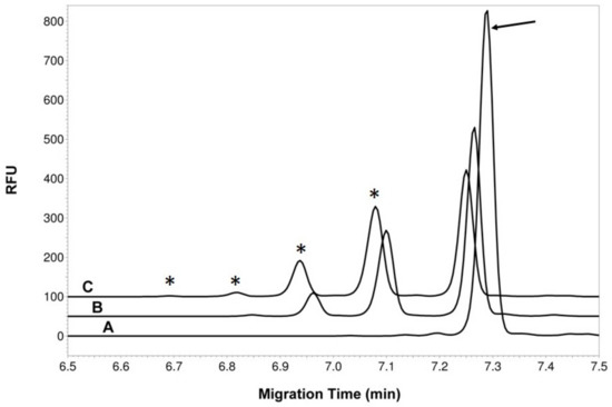 Capillary electrophoresis (CE) analysis of the MalE-SgtA reaction products. Electropherogram A is the acceptor alone (SML3 peptide labeled with FITC-Ahx, peak indicated by arrow) incubated for 24 h in presence of MalE-SgtA but without donor. Electropherogram B shows the complete reaction mix after 1 h incubation. Electropherogram C shows the complete reaction mix after 24 h incubation. The “*” indicates product peaks with added GlcNAc residue. The traces are shifted by 0.2 min to facilitate viewing of the peaks.