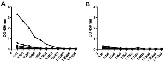 ELISA of BSA conjugated peptide/glycopeptide antigens with C. difficile anti-spore (A) and C. difficile anti-vegetative cell (B) polyclonal serum. Coating antigens are indicated as follows: BSA-SML10 peptide (black square), BSA-SML10 glycopeptide (regular triangle), BSA-SML4 peptide (inverted triangle), BSA-SML7 peptide (rhombus), BSA-SML8 peptide (circle), BSA (white square).