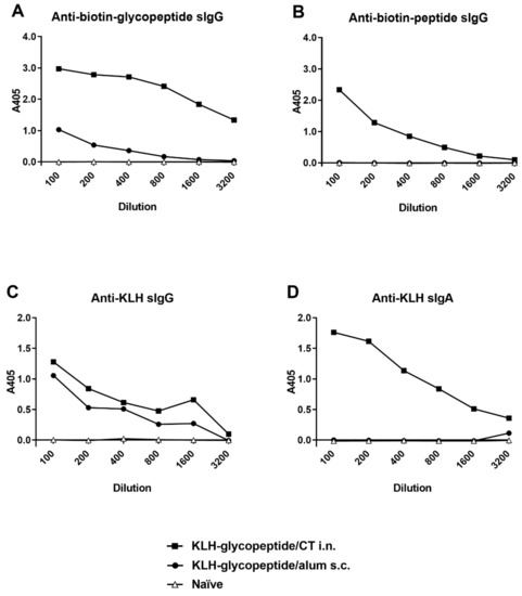 Mouse immune response to KLH-SML10 glycopeptide—comparison of immunization route and adjuvant. (A). Serum IgG recognition of Biotin-SML10 glycopeptide coating antigen. (B). Serum IgG recognition of Biotin-SML10 peptide coating antigen. (C). Serum IgG recognition of KLH. (D). Serum IgA recognition of KLH.