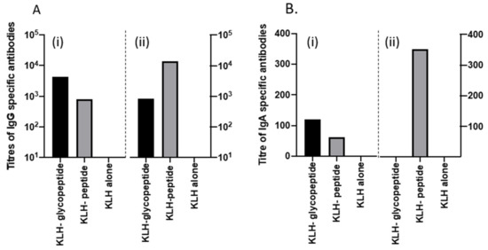 Antibody response to intranasal vaccination of the peptides and CT in the serum of mice following immunizations on days 1, 14, and 21. (A) shows the IgG specific response to both the KLH glycopeptide conjugate (balck), KLH peptide (grey), and KLH alone (white), respectively. Figure 7A (i) shows the calculated titers when the glycopeptide was used as the coating antigen and 7A (ii) when the peptide alone was used. (B) shows the IgA specific response to both the KLH glycopeptide conjugate (black), KLH peptide (grey), and KLH alone (white), respectively. Figure 7B (i) shows the calculated titers when the glycopeptide was used as the coating antigen and 7B (ii) when the peptide alone was used.