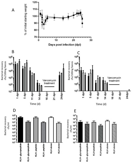 In brief, animals were vaccinated i.n. with either KLH-glycopeptide or KLH-peptide admixed with cholera toxin as described above. Nine animals, housed in two independent sterile individual ventilated cages IVC cages and fed sterile food and water ad libitum, were vaccinated with each immunogen and challenged 28 days post final vaccination (Figure 1). To ensure susceptible to infection, animals were given drinking water supplemented with clindamycin (250 mg/L) for 3 days prior to infection. Normal water was replaced for 2 days and then animals were orally challenged with 1 × 106 spores of C. difficile R20291. Infection progression was monitored quantitatively through directly plating of diluted fecal material onto Taurocholate Cycloserine-Cefotoxitin Fructose agar (TCCFA) plates and qualitatively though measurement of mouse weight. Two weeks after challenge, animals were treated for 7 days with drinking water containing vancomycin (400 mg/L) (replenished daily) to suppress C. difficile vegetative growth. Following removal of this treatment, recurrent disease was determined by measurement of individual mouse weight and recovery of the bacteria with the fecal material (as described above).