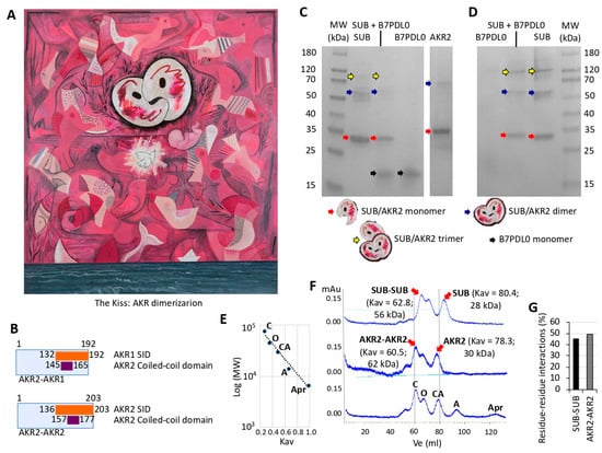 In the piece “El Beso” (The Kiss) (Figure 1A), the artist represented protein–protein interactions that appear to play a key role in the evolution and function of AKR/SUB regulatory factors []. According to artist’s statement, “this piece talks about the origins of life, with multiple geometric images that interact to illustrate in different species the conserved function of these proteins in biological processes represented by the sea, paper boat, Picasso’s dove, and a fetus growing in mother’s womb while opening the eyes to the world”. However, from a scientist’s perspective, a new and unexplored facet of possible AKR dimerization was also proposed in this piece (Figure 1A). This structural conformation and its functional implications have not been investigated before. Herein, the results from the Y2H experiment supported this prediction by showing AKR2–AKR2 and AKR2–AKR1 interactions and confirmed previous reports for AKR2–AKR1 interactions [] (Figure 1B and Figure S1, Table 1, and Data S1). The SID of AKR1 (aa 132–192) binds to the coiled-coil domain of AKR2 (aa 145–165) and the SID of AKR2 (aa 136–203) binds to the coiled-coil domain of AKR2 (aa 157–177) (Figure 1B). Additionally, in vitro experiments using PAGE and Western blot (Figure 1C,D) or SEC (Figure 1F) and predictive models (Figure 1G) supported AKR–AKR interactions resulting in protein dimerization/multimerization that require attention.