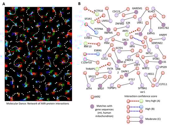 Human AKR2–protein interactions. (A) The piece “La Danza Molecular” (Molecular Dance) by Leandro Soto (mixed media on paper, 2018, 51 × 71 cm; courtesy KGJ Collection, Spain) also represents protein–protein interactions, and the possibility that AKR/SUB physically interacts with different proteins simultaneously to regulate various biological processes defined by tissue/cell-specific protein–protein interactions. (B) Results of the Y2H analysis of human AKR2 interactions in human placenta cells. Only proteins identified with A–D scores as potential candidates for interactions with AKR2 are shown. The full description of the proteins is shown in Table 1, Figure S1, and Data S1.