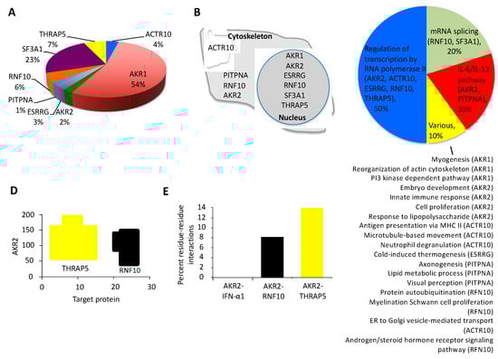 Characterization of human AKR2–protein interactions with highest confidence. (A) Representation of the percentage of total interactions after Y2H by proteins with very high and high confidence of interactions with human AKR2 in human placenta cells. (B) Subcellular localization of AKR2-interacting proteins. (C) Biological processes associated with AKR2-interacting proteins. (D) Prediction of specific interacting residues of human AKR2 with THRAP5 (Q9Y2X0) and RNF10 (Q8N5U6) proteins. The interacting residues formed by AKR2 dimer (amino acids 59-159) are not shown. (E) Predicted model of the percentage of amino acids involved in residue–residue interactions for human AKR2–interferon alpha 1 (IFN-a1) (negative control), AKR2–RNF10, and AKR2–THRAP5. Predictions in (D,E) were made using the iFrag server (http://sbi.imim.es/web/index.php/research/servers/iFrag?), and protein structure models were obtained from The Protein Model Portal.