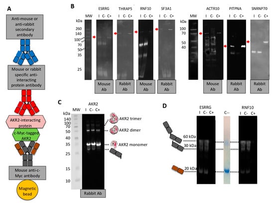 Finally, AKR2–protein interactions were confirmed in vitro with recombinant proteins for identified prey and including the SNRNP70 protein with score F (experimentally proven technical artifact) as negative control (Figure 4A–D). A protein pull-down approach was used with c-Myc magnetic beads specific for the AKR2 protein tag and followed by immunoprecipitation of AKR2-interacting recombinant proteins with antibodies specific for the interacting proteins (Figure 4A). The results showed that all AKR2-interacting protein bands were identified in the interaction (I) and with a similar size to the positive control (C+), except for the interactions with the c-Myc magnetic beads only (C-) and the non-interacting SNRNP70 negative control (Figure 4B,C). However, other protein bands were observed in both (I) and (C-) lanes at lower molecular weight than the AKR2-interacting proteins (Figure 4B,C). In order to identify these unrelated proteins eluted from the c-Myc magnetic beads, a similar experiment was conducted with selected proteins but incubating only with the secondary antibody. The results suggested that these bands corresponded to fragments of the mouse anti-c-Myc antibody attached to magnetic beads, which was further supported by the fact that these bands were more evident when using mouse-derived anti-interacting protein antibodies and the mouse secondary antibody with higher reactivity to the mouse anti-c-Myc antibody attached to magnetic beads (Figure 4A,D). Finally, this experimental approach provided additional support for AKR2–AKR2 interactions by identifying not only the AKR2 monomer, but also protein dimer and trimer (Figure 4C).