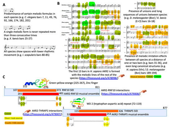 The sound of AKR evolution and protein interactions. (A) Examples of regularities observed when comparing AKR/SUB musical scores between different species (Caenorhabditis elegans akr NM_058903.6, Drosophila melanogaster akr NM_139856.4, I. scapularis akr/subolesin AY652654.1, Xenopus laevis akr2 NM_001092015.1, Salvelinus alpinus akr2 GQ247760.1, and Homo sapiens akr2 NM_018064.3; Figure S2). (B) Examples of the findings when comparing the six species in a polyphonic context (Figure S3). (C) The AKR2-RNF10 and AKR2-THRAP5 but not AKR2-IFN-α1 interactions are manifested in the higher and repeated presence of unison between both sequences (e.g., AKR2-RNF10 bars 232–235, AKR2-THRAP5 bars 83–85), as well as a higher presence of fifth and fourth consonances (e.g., AKR2–RNF10 bars 210–219, AKR2–THRAP5 bars 67–78) (Figure S4). Audio files were uploaded and can be found in Figure S4 (78998 to 479009).