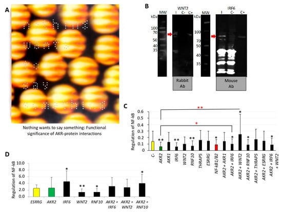Function of AKR2 interactome in the regulation of NF-κB. (A) The piece “Nothing wants to say something” by Raúl Cordero (acrylic, polyester, oil and metallic pigments on canvas, 210 × 190 cm; courtesy of the artist) challenges the view of random AKR–protein interactions and suggests that these interactions are functionally relevant in the regulation of different biological processes. (B) Western blot analysis of AKR2–IRF6 and AKR2–WNT2 interactions. Interacting proteins were incubated with AKR2 and immunoprecipitated with c-Myc magnetic beads specific for the AKR2 protein tag (I) or with the c-Myc magnetic beads only as negative control (C-). Recombinant interacting proteins were included as positive control (C+). Antibodies specific for each protein were used to identify the presence of the interacting proteins (red arrow). The origin of the primary antibody is shown. (C,D) Regulation of NF-κB in response to AKR2 and interacting proteins. (C) The NF-κB reporter was used for monitoring the activity of the NF-κB signaling pathway in human placenta-cultured cells after gene knockdown by RNAi. The ratio of firefly luminescence from the NF-κB reporter to Renilla luciferase vector control was represented as average + SD and compared between siRNA-treated groups and the siRNA negative control (C-) (black asterisks), and between combined siRNA-treated groups and the AKR2 siRNA (red asterisks) by Student’s t-test with unequal variance and one-way ANOVA with similar results (* p < 0.05, ** p < 0.005; n = 6 biological replicates). (D) The NF-κB reporter was used for monitoring the activity of the NF-κB signaling pathway in human placenta cells after transfection of recombinant proteins AKR2, RNF10, WNT2, IRF6, and combinations with AKR2. As a positive control, a FITC-antibody was transfected. Negative control cells were transfected with the ESRRG protein. The firefly to Renilla normalized luciferase activity for NF-κB reporter was represented as average + SD and compared between protein-treated groups and the ESRRG control by Student’s t-test with unequal variance (* p < 0.05, ** p < 0.005; n = 4 biological replicates).