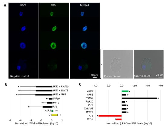 Human placenta cells were treated with 10 µg/mL of LPS from Salmonella enterica serotype typhimurium (L6143; Sigma-Aldrich) in a 24-well plate using 6 wells per treatment. LPS-treated and PBS-treated control cells were harvested after 24 h of treatment. Total RNA was extracted from placenta cells using TriReagent (Sigma-Aldrich) following the manufacturer’s recommendations and was used to characterize the mRNA levels of AKR2, AKR1, ESRRG, RNF10, THRAP5, IRF6, WNT2, IFN-β, and IL-6 genes by qRT-PCR. Normalized LPS- to PBS-treated control (C-) Ct values were calculated, and normalized Ct values were compared between LPS-treated and C-cells by chi2 test (* p = 0.01; n = 6 biological replicates).