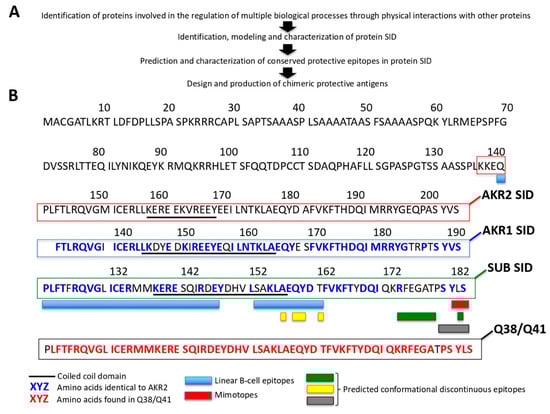 SUB/AKR interactome and possibilities for quantum vaccinomics. (A) Pipeline for quantum vaccinomics by focusing on protective epitopes in peptide sequences involved in protein–protein interactions or SID that are particularly relevant for proteins such as SUB/AKR that function through these interactions. (B) Alignment of SID amino acid sequences for human AKR2 and AKR1, and I. scapularis tick SUB with the corresponding region in the SUB/AKR chimeric Q38 and Q41 protective antigens. The Q38- and Q41-identified and/or predicted protective epitopes are shown.