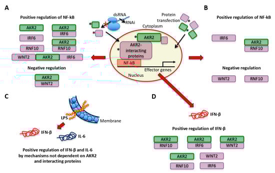 Model for NF-κB regulation by human AKR2 interactome in human placenta cells after (A) gene knockdown by RNAi, (B) protein transfection, (C) IFN-β and IL-6 expression after treatment with LPS, and (D) IFN-β expression after gene knockdown by RNAi. Predictions are based on results from experiments shown in Figure 6C,D and Figure 7B,C.