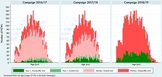 What clearly emerges from Figure 1 is that, not only the overall number of vaccinated HCWs increased (as already stated in the first sections of the results), but the increase was higher at younger ages.