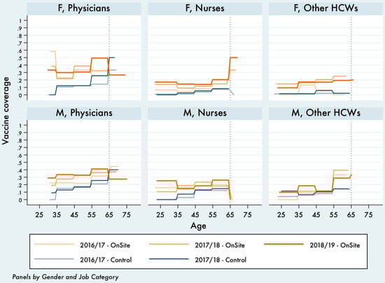 Starting from the 2015–2016 season, an increasing overall flu vaccination coverage rate trend among HCWs was registered in the FPG teaching hospital, from 6% coverage in 2015–2016 to almost 22% at the end of the 2018–2019 season. One of the reasons of this increase was the implementation of the multicomponent strategy including the education of HCWs about vaccination, the active promotion of the vaccination campaign and the easy access to influenza vaccination free of charge, obtained mainly thanks to OSV intervention. Nevertheless, the overall vaccination coverage rate was lower than those reached in other international settings [,,,,], thus remaining unsatisfactory and still far away by the minimum goal of 75% defined by the WHO and by the Italian PNPV (PNPV 2017–2019) [,]. However, the vaccination coverage registered in our teaching hospital represents an encouraging starting point and it is analogous, or even higher, than flu vaccination coverage rates registered in other national and regional settings [,,,,,,,]. Our results confirmed that physicians are the professionals most willing to get vaccinated, as reported in the literature [,,,], even though the overall increase was the lowest during the considered period if compared to nurses and OHCWs. The job category that registered the highest increase in coverage rate (compared to the previous years) were the OHCWs (+76.3%) and the nurses (+75.8%), proving that the implemented strategies were effective in reaching groups originally less inclined to vaccination, maybe due to the wrong perception of being at low risk of illness or transmitting the infection. A similar phenomenon was registered considering gender, as males had the highest vaccination coverage, but with a lower increase than women during the flu vaccination campaigns. Among the five-age class considered, the highest vaccination coverage was observed in the oldest two age classes in each of the last three campaigns, while the lowest in the youngest one. Nevertheless, the vaccination coverage has grown more in younger-age classes. Moreover, the performed multiple interactions analysis show probability estimated “high steps” for the age class of the over 65 (over 55 in Males other HCW professionals), rather independent from the on-site vaccination proposal, almost certainly due to the over 65 awareness of their status of higher-risk population. However, the performance of the OSV still works at any age and shows the possibility to reach a coverage around 40%–50% in many HCWs/gender groups in the age range 55–65, still confirming a rise in the coverage among physicians and nurses, even at younger ages, compared to the not-on-site wards in the first 2016–2017 campaign (Figure S2).