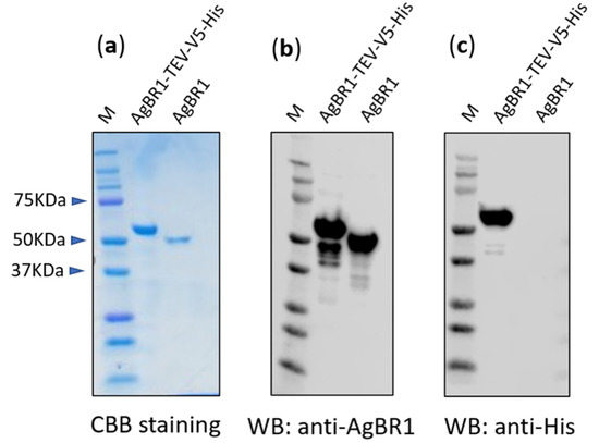 Expression of recombinant AgBR1 protein and polyhistidine-tag cleavage. Recombinant AgBR1 protein was expressed using stable transfected S2 cells, and the polyhistidine tag was cleaved by TEV protease. (a) Analysis of purified recombinant AgBR1-TEV-V5-His and His-cleaved AgBR1 protein by SDS-PAGE stained with Coomassie Brilliant Blue (CBB). (b) Analysis of AgBR1 His-cleaved recognition by rabbit anti-AgBR1 specific antibodies by Western Blotting. (c) Analysis of His-cleavage efficacy by Western Blotting using an anti-His tag specific antibody.