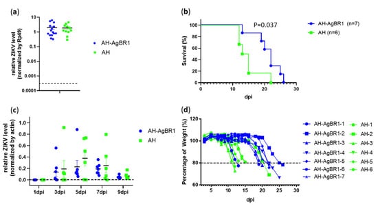 For the active immunization assays, mice were immunized subcutaneously with 10-μg AgBR1 [16,17,18,19,20] with aluminum hydroxide (AH-AgBR1) or aluminum hydroxide alone (AH) boosted twice every two weeks with the same amount of AH-AgBR1 or AH (1:1 AH-AgBR1 or AH with sterilized PBS, 300ul per dose). Two weeks after the final immunization, the mice were anaesthetized with ketamine-xylazine and challenged by ZIKV-infected mosquitoes. For mosquito infection, ZIKV-filled needles were inserted into the thorax of each mosquito and 100 plaque forming units (PFU) in a volume of 138 nl were injected, using a Nanoject II Auto-Nanoliter Injector (Drummond). Infected mosquitoes were placed back in paper cups with mesh lids and maintained in triple containment for ten days in a warm chamber. The day before challenge, two infected mosquitoes were randomly selected and placed into individual cups with mesh covers, and, the following day, the mice were anaesthetized and ZIKV-infected mosquitoes were allowed to feed on them until observing blood engorgement. After challenge, mosquitoes were knocked down on ice and their thorax was dissected to examine the virus levels after mosquito feeding. To analyze viremia levels, the blood of the mosquito-bitten mice was collected at days 1, 3, 5, 7, and 9 post infection. Survival and weights were monitored daily. Mice exhibiting a weight loss of >20% of initial body weight or neurological disease were euthanized.