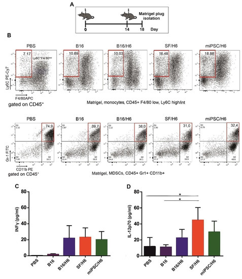 Mice were immunized twice, as described in the Methods section. Four days after the second immunization, Matrigel plugs were isolated, pooled for each research subgroup, and infiltrating immune cells were analyzed by flow cytometry, as described in the Methods section. Proinflammatory cytokine levels at the vaccination site were analyzed using a Cytometric Bead Array CBA mouse inflammation kit (BD Biosciences) (A). Immunization with SF/H6 or miPSC/H6 increased the percentage of monocytes infiltrating the Matrigel in the vaccination site (B), and decreased the percentage of MDSCs. Representative plots from two separate experiments with 6 mice in each group (B). Immunization with SF/H6 or miPSC/H6 induced local production of INFγ (C) and IL-12p70 (D); Results of three experiments (6 mice in each group) (* p < 0.05).