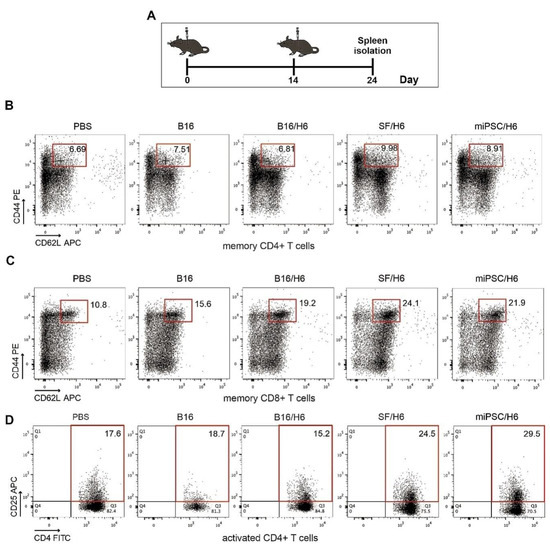 Analysis of immune cells isolated from spleens. Mice were immunized twice, as described in the Methods section. Ten days after the second immunization, spleens were collected and pooled for each research subgroup, as described in the Methods section. Cytometric analysis of isolated immune cells, T helper cytokine release assays and proliferation assays were performed (A). Immunization with SF/H6 or miPSC/H6 increased T cell activation (D) and the percentage of memory T cells in the spleen (B, C). Representative plots from two separate experiments with 5 mice in each group (B–D).