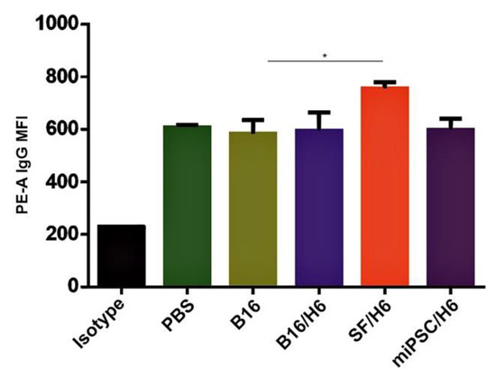 Increased amounts of antibodies directed against B16F10 antigens were observed in serum samples collected from mice immunized with SF/H6, 10 days after the priming vaccination (Figure 5).