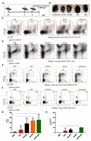 Cytometric analysis of immune cells infiltrating tumors and cytokine concentrations in the tumor site. Mice were immunized twice, as described in the Methods section (A). Seven days after the second immunization, mice were subcutaneously administered B16F10 tumor cells in Matrigel (A). Seven days after injection, the tumors in Matrigel were excised, pooled for each research subgroup, and infiltrating immune cells were analyzed by flow cytometry. Tumors in Matrigel excised from mice seven days after B16F10 administration (B). Proinflammatory cytokine levels at the tumor site were analyzed using a CBA mouse inflammation kit (BD Biosciences). Immunization with SF/H6 or miPSC/H6 increased the percentage of tumor-infiltrating dendritic cells (C), decreased the percentage of infiltrating monocytes (D), increased the percentage of infiltrating mature natural killer NK cells (E) and decreased the percentage of infiltrating regulatory T lymphocytes (F). Representative plots from two experiments with 5 mice in each group (C–F). Immunization with SF/H6 or miPSC/H6 induced the production of proinflammatory cytokines at the tumor site (G,H); results of two experiments with 5 mice in each group (* p < 0.05).