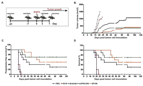 Three therapeutic vaccines and two controls were constructed. The SF/H6 vaccine consisted of 1 × 106 cells obtained from SFs, admixed with 5 × 105 B16H6 cells (B16F10 cells expressing H6). The miPSC/H6 vaccine consisted of 1 × 106 miPSCs, admixed with 5 × 105 B16H6 cells. B16/H6, which consisted of 1 × 106 wild-type B16F10 cells admixed with 5x × 105 B16H6 cells; B16, which was a control that consisted of 1.5 × 106 wild-type B16F10 cells; and PBS, which was a control that consisted of 200 μL of PBS buffer, were also used. All cells were irradiated with a dose of 80 Gy.