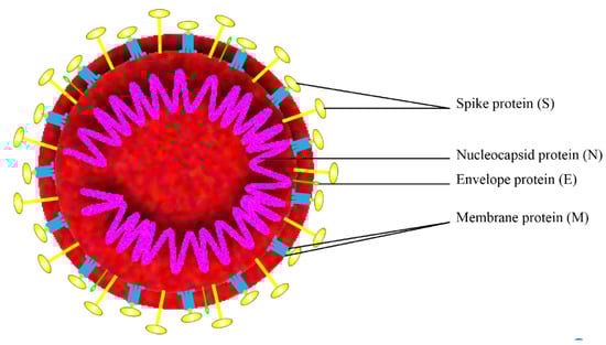 SARS-CoV-2 is a positive-strand RNA virus that belongs to the group of Betacoronaviruses. The genome of SARS-CoV-2 is approximately 29,700 nucleotides long and shares 79.5% sequence identity with SARS-CoV [], it has a long ORF1ab polyprotein at the 5′ end, which encode 15 or 16 non-structural proteins. The 3′ end of the genome encodes 4 major structural proteins, including the spike (S) protein, nucleocapsid (N) protein, membrane (M) protein, and the envelope (E) protein [], as shown in Figure 1. SARS-CoV-2 binds to the receptor angiotensin converting enzyme 2 (ACE2) on host cell for the virus entry and subsequent pathogenesis [], resulting in severe respiratory illness with symptoms of fever, cough, and shortness of breath, and severe cases can be fatal [].