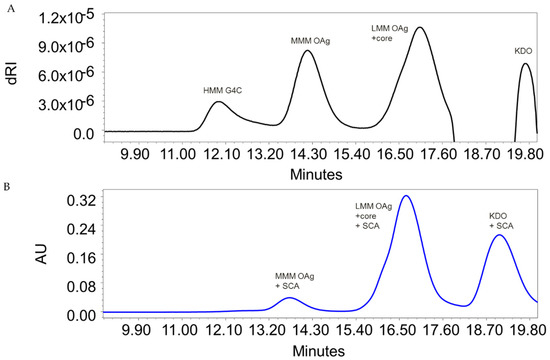 HPLC–SEC profiles of sugar extracted from S. flexneri 6 ΔtolR GMMA: (A) detection by refractive index and (B) detection at 252 nm after sugar derivatization with semicarbazide (SCA). Similar profiles were obtained for sugar extracted from all the wild-type strains analyzed (Table 1).