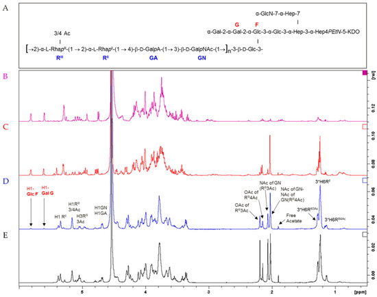 Structure of S. flexneri 6 OAg repeating unit and LPS core region (A); 1H NMR spectra of isolated core region (B); LMM OAg (C); MMM OAg (D; HMM G4C (E).