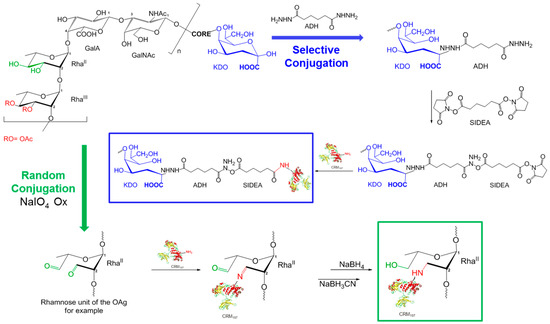 Isolated HMM G4C, MMM OAg, and LMM OAg were conjugated to CRM197 to investigate the possible impact of sugar length on the immune response induced by the corresponding glycoconjugates. A random approach, targeting multiple points along the PS chain, was used for the conjugation of the long G4C to CRM197. The aldehyde groups generated along the PS chain by random oxidation were used for direct reductive amination with lysine residues of the protein, resulting in a cross-linked and heterogeneous structure (Figure 3). A selective approach was used for the terminal linkage of LMM OAg to CRM197 so as not to alter important epitopes in the short OAg chains. The KDO sugar at the end of the OAg core region was used for introducing ADH and then SIDEA linkers, and binding to the carrier protein CRM197. Both chemistries were used to conjugate MMM OAg to CRM197 in order to verify the possible impact of conjugation chemistry on the immune response.
