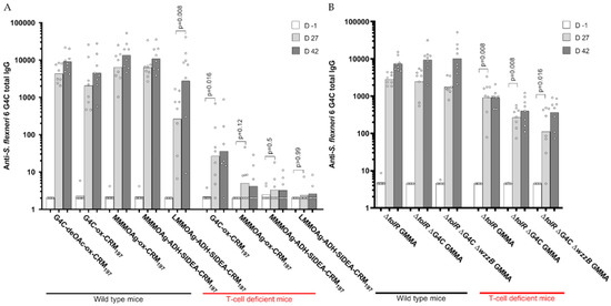 Based on the results obtained from the previous studies in mice, GMMA and glycoconjugate presenting MMM OAg were selected for a head-to-head comparison. The constructs were tested at 1 µg OAg dose with or without Alhydrogel in outbred mice. Constructs with Alhydrogel were also tested in T-cell deficient mice. In the absence of Alhydrogel, GMMA induced significantly higher specific anti-OAg total IgG than the conjugate (p = 0.0003 at day 42, two weeks after second immunization). The behavior was the opposite when the constructs were adsorbed on Alhydrogel (p = 0.0002 at day 42; Figure 8A). The results were confirmed after testing the bactericidal activity of the induced antibodies: SBA titers of antibodies induced by GMMA were significantly higher than those induced by the conjugate in the absence of Alhydrogel (p = 0.0002 at day 42), but they were not different in the presence of Alhydrogel (Figure 8B). Similar results were obtained by testing GMMA and conjugated at 0.1 µg OAg dose (data not shown).