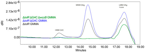 HPLC–SEC dRI profiles of sugar extracted from S. flexneri 6 ΔtolR (black), ΔtolR ΔG4C (blue), and ∆tolR ∆G4C ∆wzzB (green) GMMA.