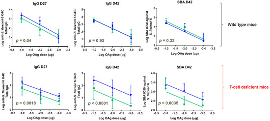 S. flexneri 6 GMMA with MMM OAg and LMM OAg (blue) or LMM OAg only (green) compared in mice. Eight wild-type and eight T-cell deficient mice per group were subcutaneously immunized at days 0 and 28, with different OAg doses without Alhydrogel. Each curve represents log-transformed doses on the abscissa and the log-transformed ELISA units or SBA titers on the ordinate. The parallelism of the lines was tested by comparison of the slopes, which resulted in not-significant difference. Subsequently, the Y-intercept of the curves obtained for the two GMMA were compared and the p-value is reported in each graph.