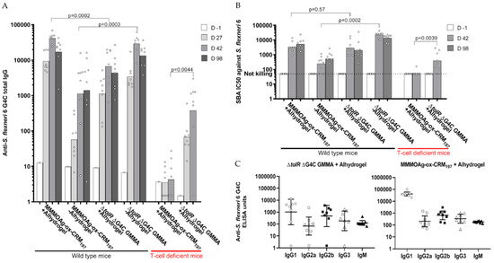 Analysis of anti-antigen specific IgG subclasses and IgM was performed on sera collected at day 42. Both GMMA and the glycoconjugate induced not only IgG1 but also IgG2a, IgG2b, IgG3, and IgM (Figure 8C). Immunization of T-cell deficient mice confirmed the ability of GMMA, but not of the glycoconjugate, to induce a significant response, both in terms of anti-OAg total IgG and SBA titers (Figure 8). However, both GMMA and the glycoconjugate were able to induce persistent responses in mice, as verified by the IgG and SBA titers at day 98, 70 days after the second immunization (Figure 8).