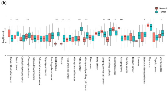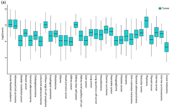 CXCR4 expression in tumors. (a) CXCR4 expression in different tumors is investigated by public gene expression data from the Firebrowse repository [71]. Gene expression levels (as normalized RNA-Seq by Expectation Maximization (RSEM) values) were downloaded and distribution boxplots were performed using the ggplot2 R package (version 2_3.2.0) [72] (b) Differential expression analysis between normal and tumor samples was performed using the edgeR package (R version 3.5.1; edgeR version 3.24.3) [73,74]. p-values are defined with Fisher’s exact Test.