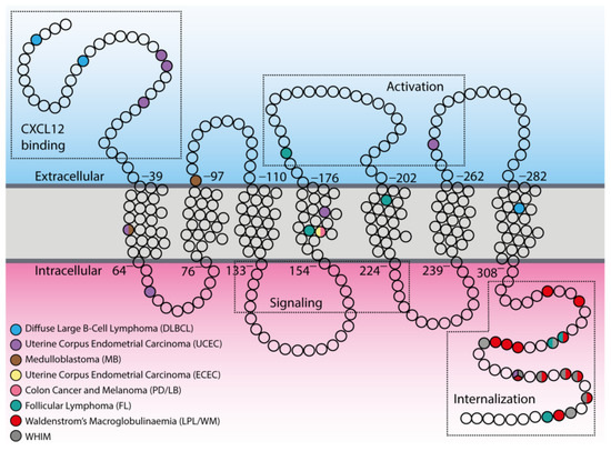 Distribution of tumor-associated mutations within CXCR4 topology. In the scheme, principal components of the CXCR4 structure are indicated with the dotted boxes in both extracellular and intracellular compartments (CXCL12 binding, activation sites, signaling, and internalization regions). Empty circles represent single amino acids, while colored circles indicate mutated ones.