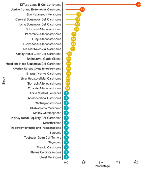 Recently, several efforts have been made to integrate the amount of data coming from large-scale genome sequencing analysis of tumors, including the setting up of a dataset repository named The Cancer Genome Atlas (TCGA), which has collected and characterized more than 20 tumor types. Therefore, through a bioinformatics analysis of TCGA, it is possible to explore the tumor-associated genomic landscape of CXCR4. The analysis reveals the presence of several mutated variants of CXCR4, including WHIM-like mutations (Table 1). Nevertheless, the frequency of CXCR4 mutations is very low compared to LPL/WM (Figure 3). However, although an altered expression of CXCR4 has been reported for several cancer types (Figure 1), a significant frequency of CXCR4 mutated variants has been detected in only two cancer types—the uterine corpus endometrial carcinoma (uterine cancer, UCEC), which is the fourth most common cancer in females and accounts for approximately 80% of endometrial adenocarcinomas, and the DLBCL, the most common aggressive form of B-cell NHL (Table 1, Figure 2 and Figure 3). Importantly, while most of the CXCR4-mutated UCEC exhibit mutations in the N-terminal region (N-ter), variants in the C-ter have been reported in only one patient, where a WHIM-like mutation was identified. Conversely, in CXCR4-mutated DLBCL cases, both N-ter and C-ter mutations of CXCR4 exhibit almost the same frequency. In particular, the C-ter-mutated variants have been reported as chimeric proteins, where a region of CXCR4, including the C-ter, is replaced by CFLAR, an apoptosis regulator protein, along with Immunoglobulin Heavy Constant Alpha 2 (IGHA2), the constant region of immunoglobulin heavy chains.