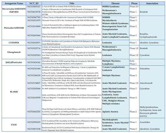 - Randhawa, S.; Cho, B.S.; Ghosh, D.; Sivina, M.; Koehrer, S.; Muschen, M.; Peled, A.; Davis, R.E.; Konopleva, M.; Burger, J.A. Effects of pharmacological and genetic disruption of CXCR4 chemokine receptor function in B-cell acute lymphoblastic leukaemia. Br. J. Haematol. 2016, 174, 425–436. [Google Scholar] [CrossRef]