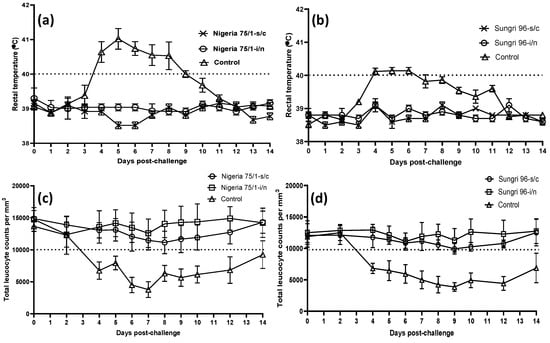 Average rectal temperature and leucocyte count in goats following challenge with virulent peste des petits ruminants virus (PPRV). Average rectal temperature and leucocyte count of five animals in each group are shown in the graph. (a) Average rectal temperature in Nigeria 75/1 vaccine study; (b) average rectal temperature in Sungri 96 vaccine study; (c): average leucocyte count in Nigeria 75/1 vaccine study; (d) average leucocyte count in Sungri 96 vaccine study. The dotted line in each graph shows the normal body temperature/leucocyte count.
