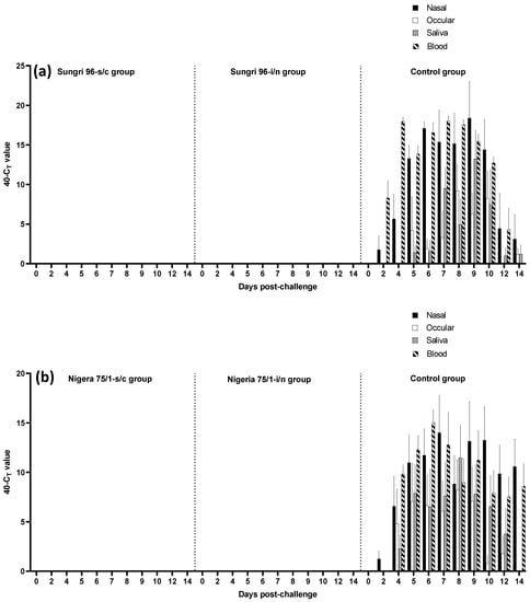 PPRV-specific RNA was measured by reverse-transcription—real-time PCR (RT-qPCR) and the amount of viral RNA is expressed as the mean 40-CT value, a value which increases as the amount of viral RNA increases. Average values for five animals in each group on different days post-challenge are shown. (a) Nigeria 75/1 vaccine study; (b) Sungri 96 vaccine study.