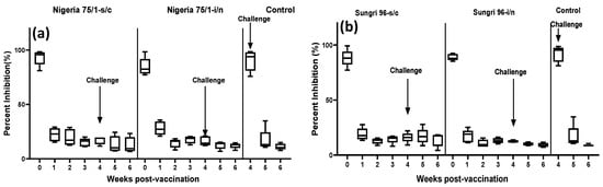 Anti-N antibody response following vaccination and challenge as measured by N-protein based cELISA. The results are presented as percent inhibition values. The data are presented as box-and-whisker plots, in which the bars span the minimum and maximum values of five animals, and the box shows the range from the first to the third quartile. The central horizontal line in each box shows the median value. Day of challenge is shown by an arrow in each graph. (a): Percent inhibition values in Nigeria 75/1 vaccine study; (b) percent inhibition values in Sungri 96 vaccine study.