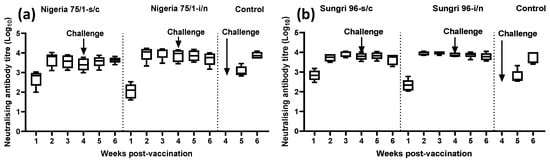 Neutralizing antibody response in goats following vaccination and challenge. The data are presented as box-and-whisker plots, in which the bars span the minimum and maximum values of five animals, and the box shows the range from the first to the third quartile. The central horizontal line in each box shows the median value. Day of challenge is shown by an arrow in each graph. (a) Neutralizing antibody titers in Nigeria 75/1 vaccine study; (b): neutralizing antibody titers in Sungri 96 vaccine study.