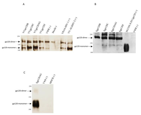 Western blot analysis of envelope gp120t expressed by recombinant Vaccinia viruses. HeLa cells were infected with recombinant Vaccinia viruses expressing envelope gp120t from HIV-1 clades B (VVgp120B), C (VVgp120C), J (VVgp120J), and CRF_AG (VVgp120AG). Cell lysates (A) and cell supernatants (B) were incubated with sera from HIV-1 infected individuals. Supernatant from cells infected with VVgp120AG was also incubated with bNAb 447-52D (anti-V3) (C). Positive controls for these experiments were recombinant Vaccinia viruses expressing the HIV-1 envelope (vPE16), the HIV-2 envelope (rVV/ALI), and a consensus group M envelope gp120 (M.CON.S-D11). Negative controls were uninfected cells (mock) and cells infected with the WR strain of Vaccinia virus (VWR). Molecular weight is indicated in KDa on the left.
